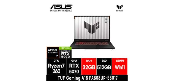 에이수스 TUF 게이밍 A18 라이젠7 지포스 RTX 5070, 예거 그레이, 512GB, 32GB, WIN11 Home, FA808UP-S8017을(를) 가장 저렴하게 살 수 있는 곳은?