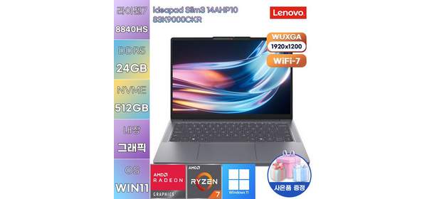 레노버 아이디어패드 Slim3 14AHP10 83K9000CKR R7-8840HS Radeon 760M WIN11 설치 사무용 업무용 노트북, WIN11 Pro, 24GB, 512GB