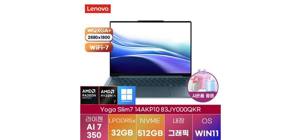 레노버 요가 Slim7 14AKP10 83JY000QKR AI R7 350 Radeon 860M WIN 11 HOME 인강용 업무용 노트북, WIN11 Home, 512GB, 512GB